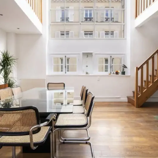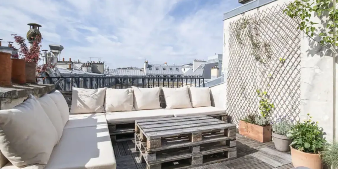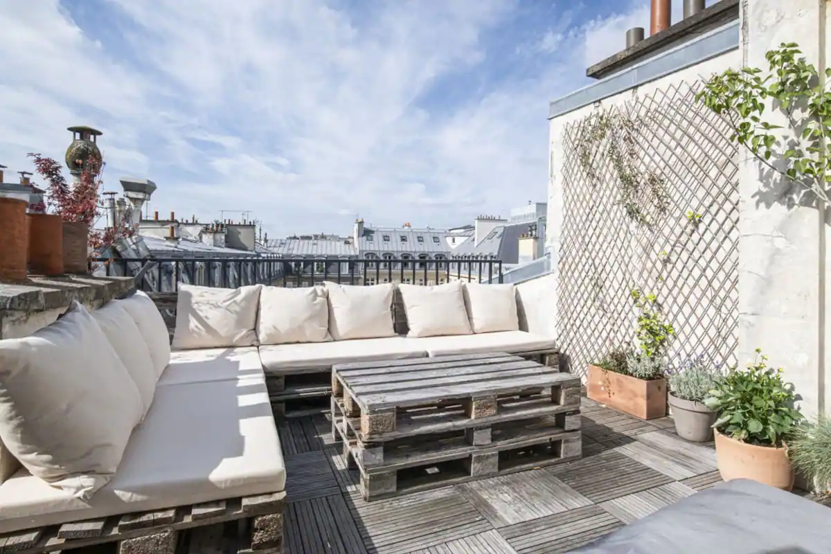 et une terrasse sur le toit de 40m2 avec une jolie vue sur un hôtel particulier.